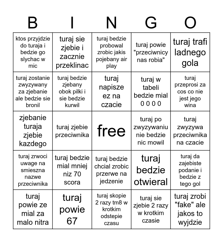 This bingo card has a free space and 24 words: turaj bedzie mial mniej niz 70 scora, turaj powie 67, turaj napisze ez na czacie, turaj powie ze mial za malo nitra, turaj trafi ladnego gola, ktos przyjdzie do turaja i bedzie go slychac w mic, turaj zostanie zwyzywany za zjebanie ale bedzie sie bronil, turaj sie zjebie i zacznie przeklinac, turaj po zwyzywaniu nie bedzie nic mowil, turaj bedzie chcial zrobic przerwe na jedzenie, turaj w tabeli bedzie mial 0 0 0 0, zjebanie turaja zjebie kazdego, turaj bedzie otwieral, turaj da zajebiste podanie i bedzie z tego gol, turaj bedzie zjebany obok pilki i sie bedzie kurwil, turaj sie zjebie 2 razy w krotkim czasie, turaj zwyzywa przeciwnika na czacie, turaj bedzie probowal zrobic jakis pojebany air play, turaj przeprosi za cos co nie jest jego wina, turaj zjebie przeciwnika, turaj zrobi "fake" ale jakos to wyjdzie, turaj zrwoci uwage na smieszna nazwe przeciwnika, turaj powie "przeciwnicy nas robia" and turaj skopie 2 razy tm8 w krotkim odstepie czasu.
