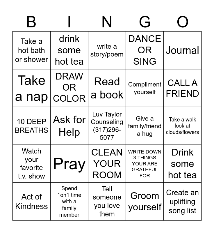 This bingo card has a free space and 24 words: Pray, Spend 1on1 time with a family member, Read a book, Act of Kindness, Journal, Take a hot bath or shower, Take a nap, drink some hot tea, Give a family/friend a hug, CLEAN YOUR ROOM, Compliment yourself, 10 DEEP BREATHS, WRITE DOWN 3 THINGS YOUR ARE GRATEFUL FOR, Drink some hot tea, DRAW OR COLOR, Groom yourself, Take a walk look at clouds/flowers, write a story/poem, CALL A FRIEND, Ask for Help, Create an uplifting song list, Watch your favorite t.v. show, DANCE OR SING and Tell someone you love them.