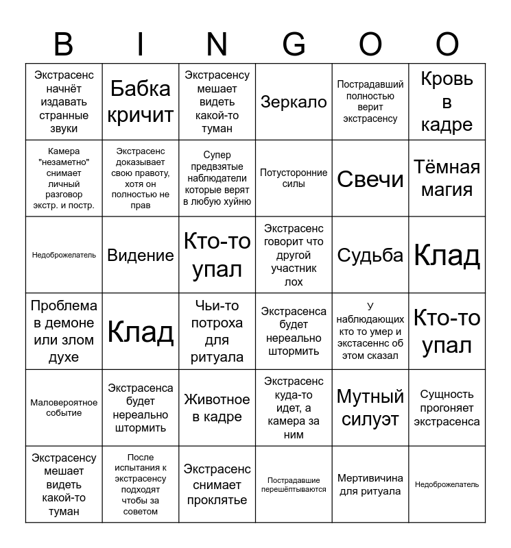This bingo card has 36 words: Экстрасенс куда-то идет, а камера за ним, Животное в кадре, Пострадавшие перешёптываются, Камера "незаметно" снимает личный разговор экстр. и постр., Проблема в демоне или злом духе, Экстрасенс говорит что другой участник лох, Экстрасенс доказывает свою правоту, хотя он полностью не прав, Экстрасенс снимает проклятье, Пострадавший полностью верит экстрасенсу, Мутный силуэт, Тёмная магия, Зеркало, Сущность прогоняет экстрасенса, Видение, Потусторонние силы, Экстрасенс начнёт издавать странные звуки, Маловероятное событие, Судьба, Недоброжелатель, Экстрасенсу мешает видеть какой-то туман, Кто-то упал, Клад, Экстрасенса будет нереально штормить, Чьи-то потроха для ритуала, У наблюдающих кто то умер и экстасеннс об этом сказал, Бабка кричит, Свечи, После испытания к экстрасенсу подходят чтобы за советом, Супер предвзятые наблюдатели которые верят в любую хуйню, Кровь в кадре, Недоброжелатель, Экстрасенсу мешает видеть какой-то туман, Кто-то упал, Клад, Экстрасенса будет нереально штормить and Мертивичина для ритуала.