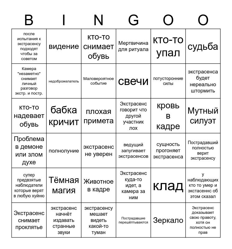 This bingo card has 36 words: Экстрасенс куда-то идет, а камера за ним, Животное в кадре, Пострадавшие перешёптываются, Камера "незаметно" снимает личный разговор экстр. и постр., Проблема в демоне или злом духе, Экстрасенс говорит что другой участник лох, недоброжелатель, экстрасенсу мешает видеть какой-то туман, кто-то упал, клад, экстрасенса будет нереально штормить, Мертвичина для ритуала, у наблюдающих кто то умер и экстасеннс об этом сказал, бабка кричит, свечи, после испытания к экстрасенсу подходят чтобы за советом, супер предвзятые наблюдатели которые верят в любую хуйню, кровь в кадре, кто-то надевает обувь, кто-то снимает обувь, плохая примета, полнолуние, ведущий запугивает экстрасенсов, экстрасенс не уверен, сущность прогоняет экстрасенса, видение, потусторонние силы, экстрасенс начнёт издавать странные звуки, Маловероятное событие, судьба, Экстрасенс доказывает свою правоту, хотя он полностью не прав, Экстрасенс снимает проклятье, Пострадавший полностью верит экстрасенсу, Мутный силуэт, Тёмная магия and Зеркало.