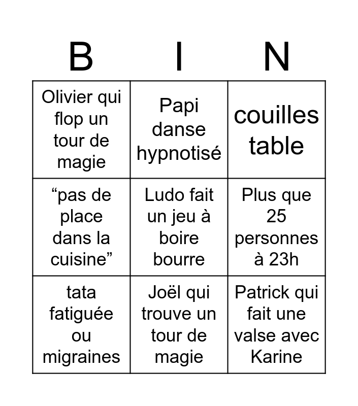 This bingo card has a free space and 24 words: Papi qui pleure pdt la chanson, Tiago qui fait un foot, Joël qui trouve un tour de magie, Maxence se foire à la guitare, Patrick qui fait une valse avec Karine, Olivier qui flop un tour de magie, Plus que 25 personnes à 23h, Papi danse hypnotisé, flex études des cousines, pas de cadeau, anecdote boxe 300BC, macron, coronavirus, nouveau taff tonton flex, tata fatiguée ou migraines, demain nous appartient, oreo ingérable, couilles table, mention manoir, trajet cher, anecdote espagne/irlande, tjrs pas réveillée clémentine?, “pas de place dans la cuisine” and “ça change de chez nous”.