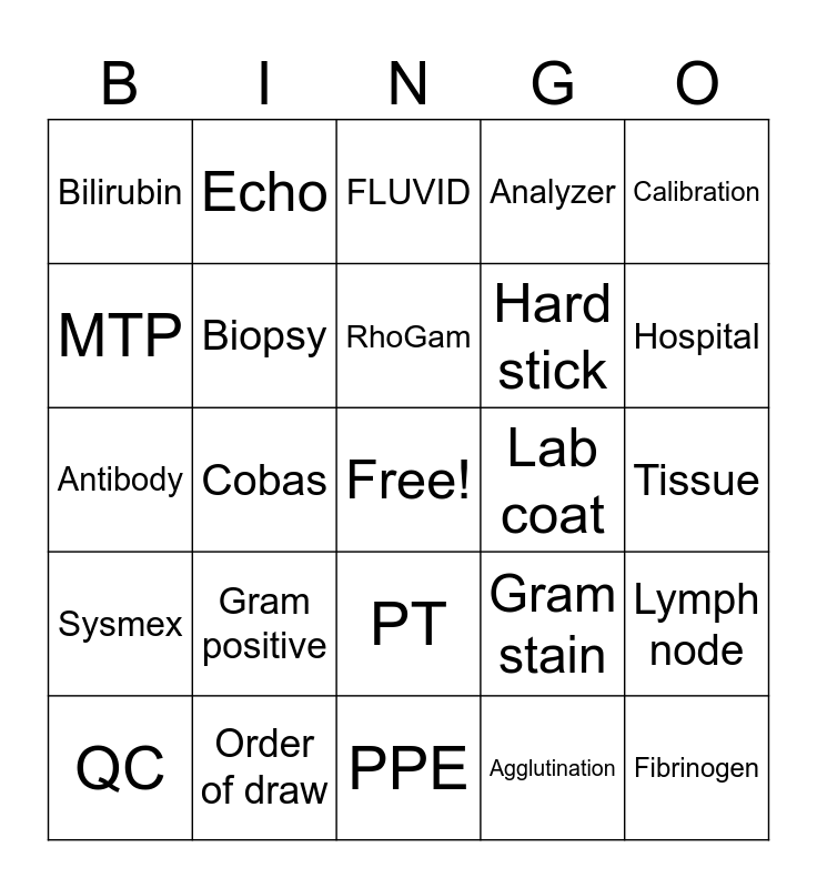 This bingo card has a free space and 24 words: Gram positive, Order of draw, RhoGam, QC, Calibration, Bilirubin, MTP, Echo, Lab coat, PT, Hard stick, Antibody, Gram stain, Lymph node, Biopsy, Agglutination, Tissue, FLUVID, Hospital, Cobas, Fibrinogen, Sysmex, Analyzer and PPE.