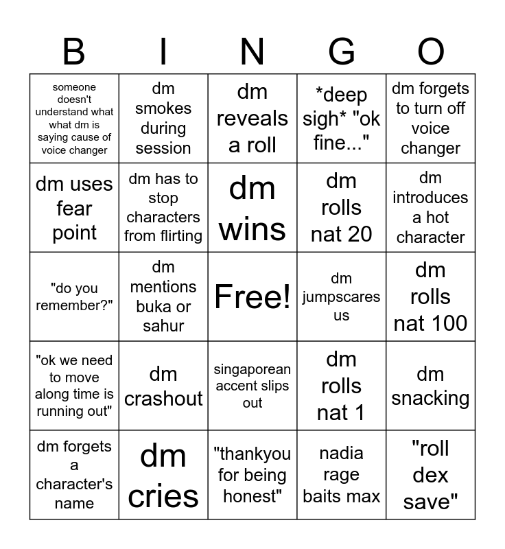This bingo card has a free space and 24 words: dm crashout, dm cries, dm wins, dm forgets a character's name, dm forgets to turn off voice changer, someone doesn't understand what what dm is saying cause of voice changer, dm uses fear point, dm smokes during session, dm jumpscares us, singaporean accent slips out, dm rolls nat 20, "do you remember?", dm rolls nat 1, dm snacking, dm has to stop characters from flirting, nadia rage baits max, dm rolls nat 100, dm reveals a roll, dm introduces a hot character, dm mentions buka or sahur, "roll dex save", "ok we need to move along time is running out", *deep sigh* "ok fine..." and "thankyou for being honest".