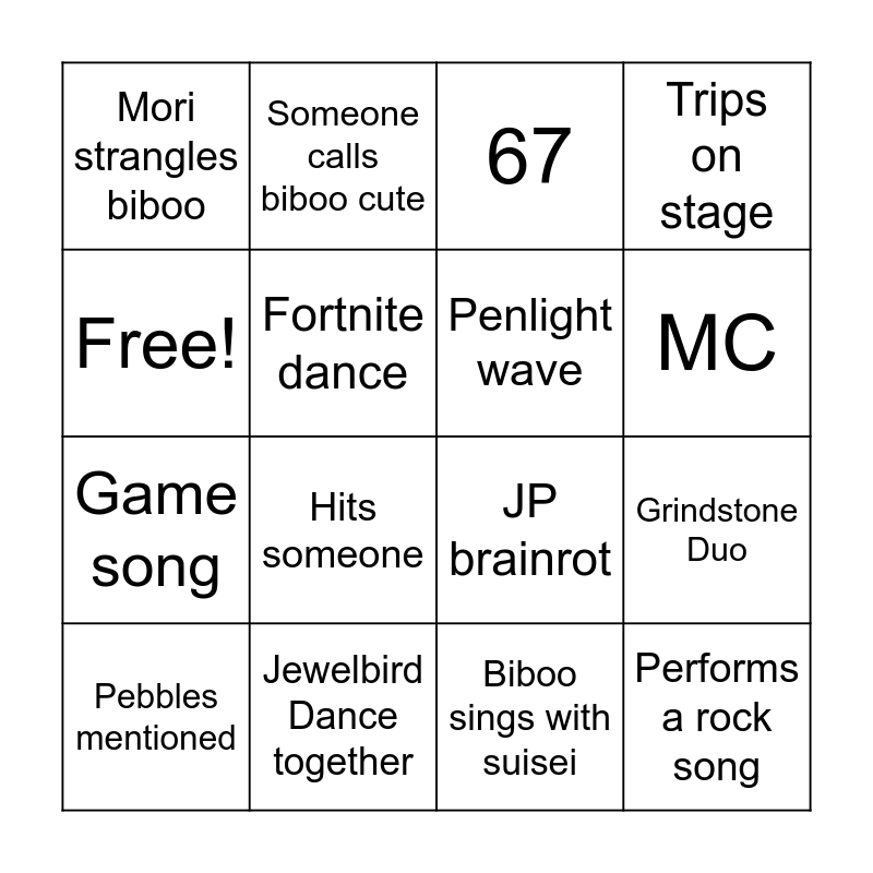 This bingo card has 16 words: Jewelbird Dance together, Grindstone Duo, 67, Mori strangles biboo, Game song, Someone calls biboo cute, JP brainrot, Biboo sings with suisei, Free!, Fortnite dance, Pebbles mentioned, Trips on stage, Hits someone, MC, Penlight wave and Performs a rock song.
