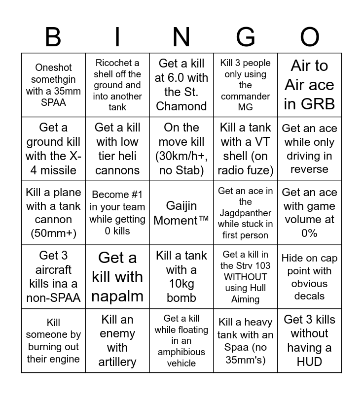 This bingo card has a free space and 24 words: Get a kill with napalm, Kill an enemy with artillery, On the move kill (30km/h+, no Stab), Kill someone by burning out their engine, Air to Air ace in GRB, Oneshot somethgin with a 35mm SPAA, Get a ground kill with the X-4 missile, Ricochet a shell off the ground and into another tank, Get an ace in the Jagdpanther while stuck in first person, Kill a tank with a 10kg bomb, Kill a tank with a VT shell (on radio fuze), Kill a plane with a tank cannon (50mm+), Get a kill in the Strv 103 WITHOUT using Hull Aiming, Hide on cap point with obvious decals, Get a kill with low tier heli cannons, Kill a heavy tank with an Spaa (no 35mm's), Get an ace with game volume at 0%, Get a kill at 6.0 with the St. Chamond, Get an ace while only driving in reverse, Become #1 in your team while getting 0 kills, Get 3 kills without having a HUD, Get 3 aircraft kills ina a non-SPAA, Kill 3 people only using the commander MG and Get a kill while floating in an amphibious vehicle.