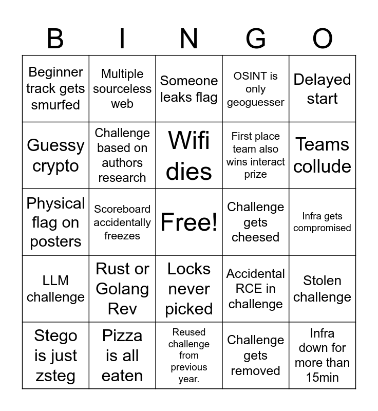 This bingo card has a free space and 24 words: Rust or Golang Rev, Pizza is all eaten, Wifi dies, Stego is just zsteg, Delayed start, Beginner track gets smurfed, Guessy crypto, Multiple sourceless web, Challenge gets cheesed, Locks never picked, First place team also wins interact prize, Physical flag on posters, Accidental RCE in challenge, Stolen challenge, Challenge based on authors research, Challenge gets removed, Infra gets compromised, Someone leaks flag, Teams collude, Scoreboard accidentally freezes, Infra down for more than 15min, LLM challenge, OSINT is only geoguesser and Reused challenge from previous year..