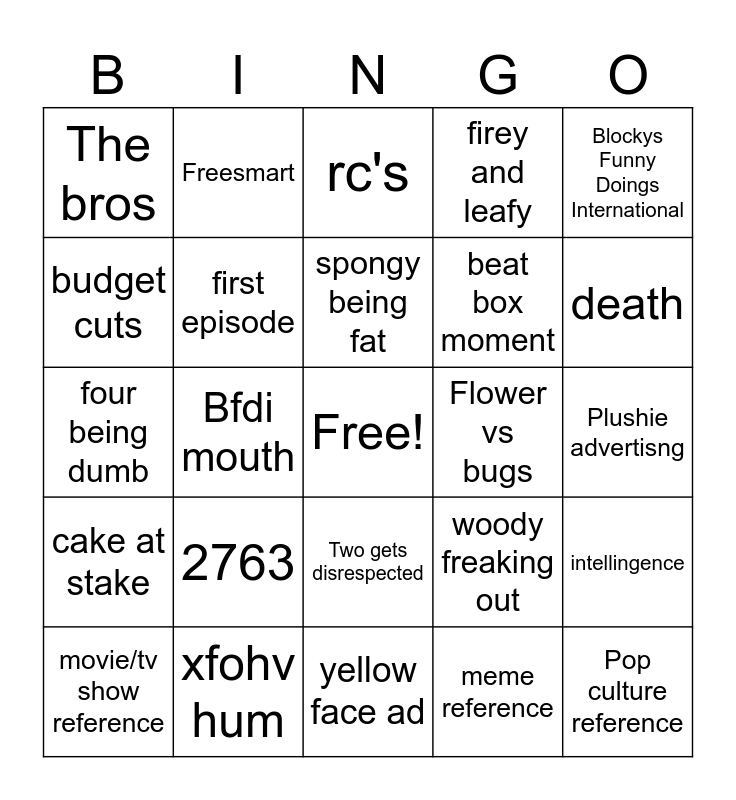 This bingo card has a free space and 24 words: 2763, xfohv hum, spongy being fat, movie/tv show reference, Blockys Funny Doings International, The bros, budget cuts, Freesmart, Flower vs bugs, Two gets disrespected, beat box moment, four being dumb, woody freaking out, intellingence, first episode, meme reference, Plushie advertisng, rc's, death, Bfdi mouth, Pop culture reference, cake at stake, firey and leafy and yellow face ad.