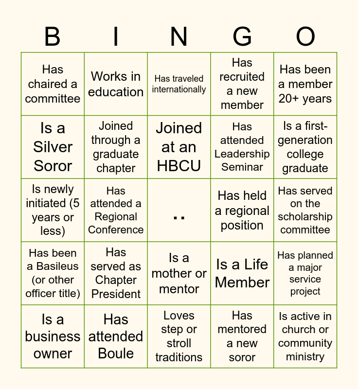 This bingo card has a free space and 24 words: Has served as Chapter President, Has attended Boule, Joined at an HBCU, Is a business owner, Has been a member 20+ years, Has chaired a committee, Is a Silver Soror, Works in education, Has held a regional position, Is a mother or mentor, Has attended Leadership Seminar, Is newly initiated (5 years or less), Is a Life Member, Has planned a major service project, Joined through a graduate chapter, Has mentored a new soror, Has served on the scholarship committee, Has traveled internationally, Is a first-generation college graduate, Has attended a Regional Conference, Is active in church or community ministry, Has been a Basileus (or other officer title), Has recruited a new member and Loves step or stroll traditions.