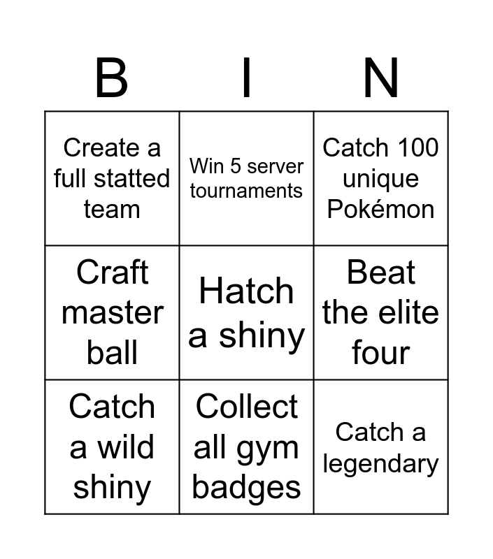 This bingo card has 9 words: Catch a wild shiny, Hatch a shiny, Catch 100 unique Pokémon, Create a full statted team, Win 5 server tournaments, Beat the elite four, Craft master ball, Collect all gym badges and Catch a legendary.