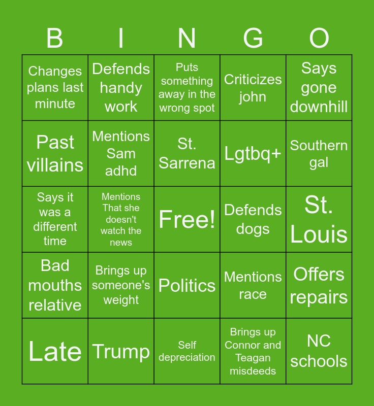 This bingo card has a free space and 29 words: Late, Goes off on their own, Mentions That she doesn't watch the news, Seeks approval for misbehavior, Changes plans last minute, Puts something away in the wrong spot, Mentions Sam adhd, Brings up someone's weight, Defends dogs, Trump, St. Louis, NC schools, Self depreciation, Brings up Connor and Teagan misdeeds, Southern gal, Sneaks away with Rob, Politics, Bad mouths relative, Says gone downhill, Says it was a different time, Mentions race, Mentions religion, Lgtbq+, Past villains, Criticizes john, Defends handy work, Offers repairs, St. Sarrena and Christi.