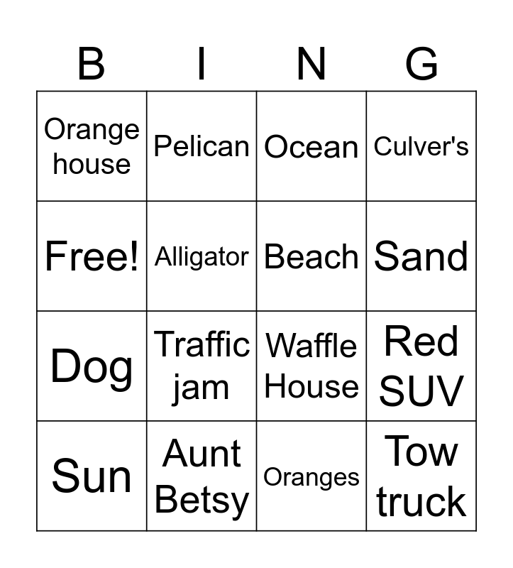 This bingo card has 16 words: Aunt Betsy, Red SUV, Ocean, Orange house, Dog, Pelican, Waffle House, Oranges, Free!, Alligator, Sun, Culver's, Traffic jam, Sand, Beach and Tow truck.