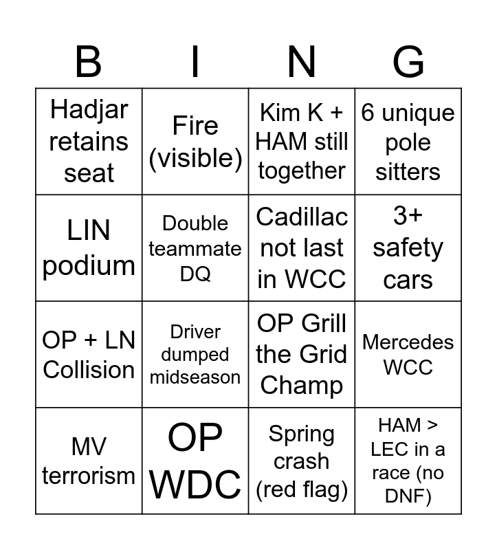 This bingo card has 16 words: OP WDC, Mercedes WCC, Kim K + HAM still together, Hadjar retains seat, OP + LN Collision, Fire (visible), OP Grill the Grid Champ, Spring crash (red flag), LIN podium, Double teammate DQ, MV terrorism, 6 unique pole sitters, Driver dumped midseason, 3+ safety cars, Cadillac not last in WCC and HAM > LEC in a race (no DNF).