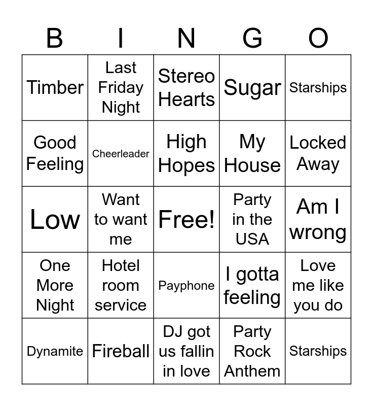This bingo card has a free space and 24 words: Hotel room service, Fireball, High Hopes, Dynamite, Starships, Timber, Good Feeling, Last Friday Night, Party in the USA, Payphone, My House, Low, I gotta feeling, Love me like you do, Cheerleader, Party Rock Anthem, Am I wrong, Stereo Hearts, Locked Away, Want to want me, Starships, One More Night, Sugar and DJ got us fallin in love.