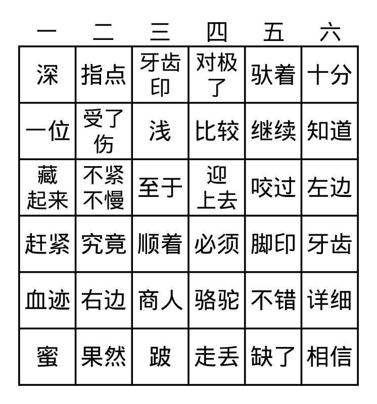 This bingo card has 36 words: 骆驼, 商人, 走丢, 一位, 赶紧, 迎 上去, 受了伤, 跛, 驮着, 不错, 知道, 对极了, 详细, 不紧不慢, 比较, 深, 血迹, 咬过, 藏 起来, 牙齿印, 至于, 究竟, 必须, 顺着, 脚印, 指点, 继续, 果然, 浅, 十分, 相信, 蜜, 牙齿, 左边, 右边 and 缺了.