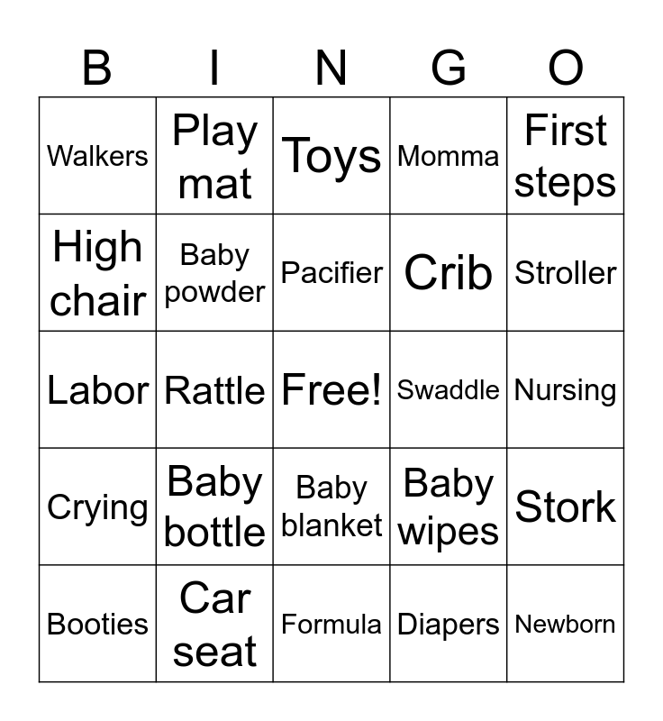 This bingo card has a free space and 24 words: Baby bottle, Car seat, Pacifier, Booties, First steps, Walkers, High chair, Play mat, Swaddle, Baby blanket, Crib, Labor, Baby wipes, Stork, Baby powder, Diapers, Nursing, Toys, Stroller, Rattle, Newborn, Crying, Momma and Formula.