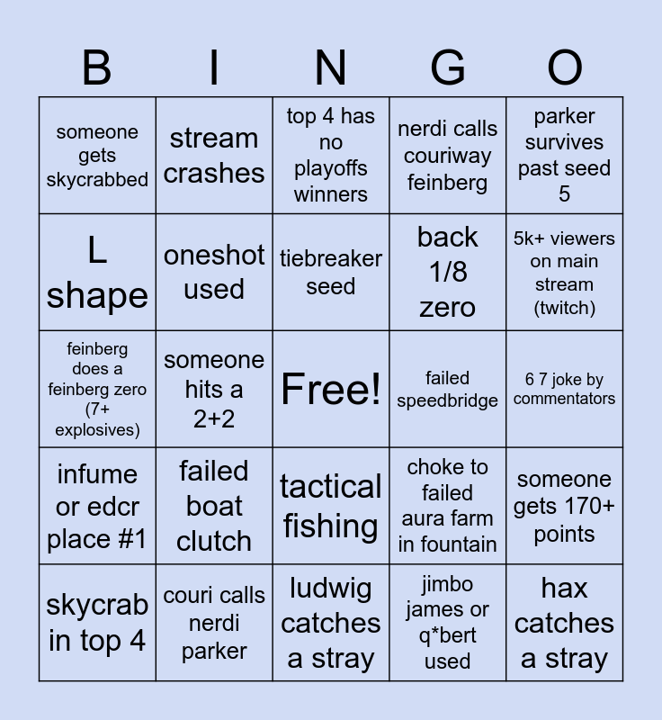 This bingo card has a free space and 24 words: failed boat clutch, couri calls nerdi parker, tiebreaker seed, skycrab in top 4, parker survives past seed 5, someone gets skycrabbed, L shape, stream crashes, failed speedbridge, tactical fishing, back 1/8 zero, feinberg does a feinberg zero (7+ explosives), choke to failed aura farm in fountain, someone gets 170+ points, oneshot used, jimbo james or q*bert used, 6 7 joke by commentators, top 4 has no playoffs winners, 5k+ viewers on main stream (twitch), someone hits a 2+2, hax catches a stray, infume or edcr place #1, nerdi calls couriway feinberg and ludwig catches a stray.