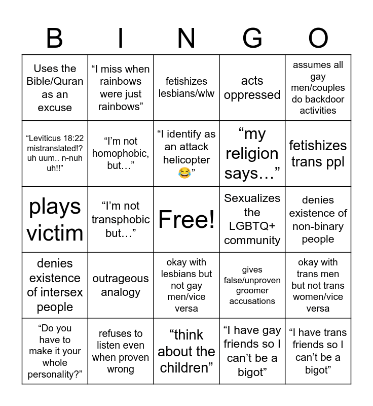 This bingo card has a free space and 24 words: outrageous analogy, refuses to listen even when proven wrong, “I identify as an attack helicopter 😂”, “Do you have to make it your whole personality?”, assumes all gay men/couples do backdoor activities, Uses the Bible/Quran as an excuse, “Leviticus 18:22 mistranslated!? uh uum.. n-nuh uh!!”, “I miss when rainbows were just rainbows”, Sexualizes the LGBTQ+ community, okay with lesbians but not gay men/vice versa, “my religion says…”, plays victim, gives false/unproven groomer accusations, okay with trans men but not trans women/vice versa, “I’m not homophobic, but…”, “I have gay friends so I can’t be a bigot”, denies existence of non-binary people, fetishizes lesbians/wlw, fetishizes trans ppl, “I’m not transphobic but…”, “I have trans friends so I can’t be a bigot”, denies existence of intersex people, acts oppressed and “think about the children”.