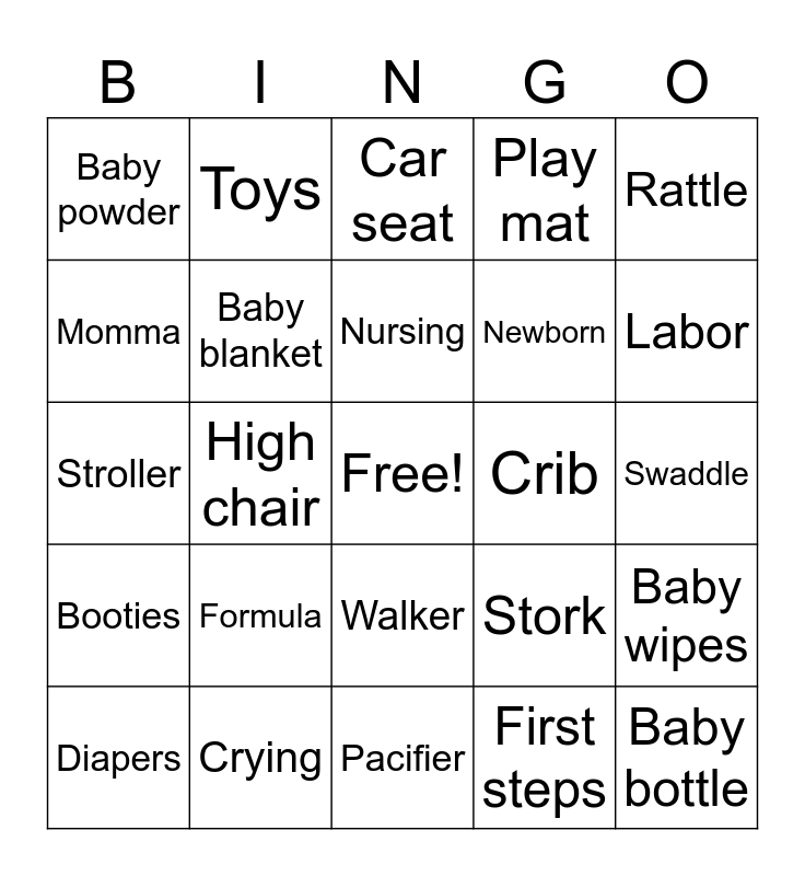 This bingo card has a free space and 24 words: Formula, Crying, Nursing, Diapers, Rattle, Baby powder, Momma, Toys, Crib, Walker, Newborn, Stroller, Stork, Baby wipes, Baby blanket, First steps, Swaddle, Car seat, Labor, High chair, Baby bottle, Booties, Play mat and Pacifier.
