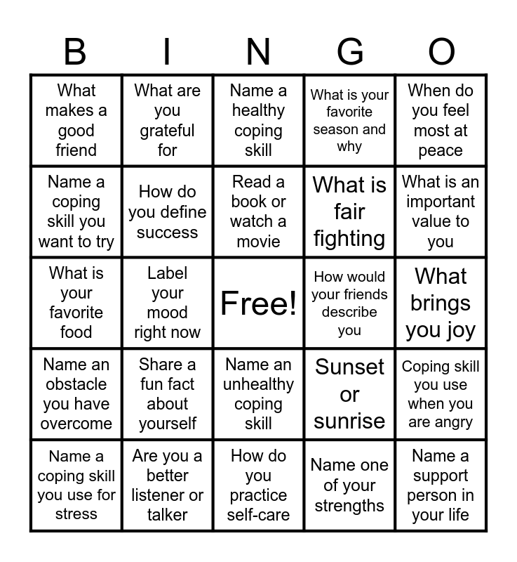This bingo card has a free space and 29 words: Name a coping skill you use for stress, Where is your calm safe place, Label your mood right now, How do you relax, What makes a good friend, Name a healthy coping skill, How do you define success, Share a fun fact about yourself, How would your friends describe you, Are you a better listener or talker, What brings you joy, Name a support person in your life, How do you practice self-care, Name one of your strengths, What is an important value to you, Dream vacation, Name an unhealthy coping skill, Name an obstacle you have overcome, When do you feel most at peace, What is your favorite food, Sunset or sunrise, What motivates you, What is fair fighting, Name a coping skill you want to try, What is your favorite season and why, What are you grateful for, Coping skill you use when you are angry, Read a book or watch a movie and How do you express happiness.