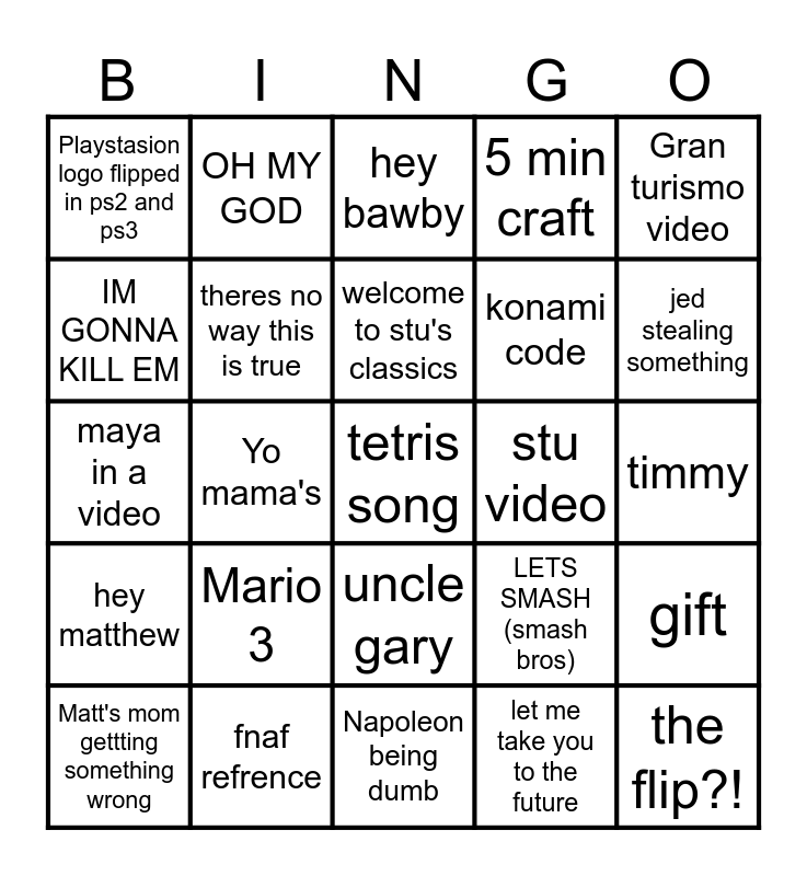 This bingo card has 25 words: Mario 3, Napoleon being dumb, welcome to stu's classics, Matt's mom gettting something wrong, Gran turismo video, Playstasion logo flipped in ps2 and ps3, IM GONNA KILL EM, OH MY GOD, stu video, uncle gary, konami code, maya in a video, LETS SMASH (smash bros), gift, theres no way this is true, the flip?!, timmy, hey bawby, jed stealing something, Yo mama's, tetris song, fnaf refrence, hey matthew, 5 min craft and let me take you to the future.