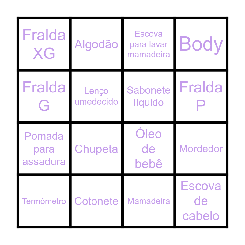 This bingo card has 25 words: Free!, Fralda RN, Fralda P, Fralda M, Fralda G, Fralda XG, Lenço umedecido, Algodão, Cotonete, Talco, Pomada para assadura, Óleo de bebê, Shampoo, Sabonete, Sabonete líquido, Toalha de banho, Mamadeira, Escova para lavar mamadeira, Chupeta, Mordedor, Termômetro, Kit manicure, Escova de cabelo, Body and Meia.