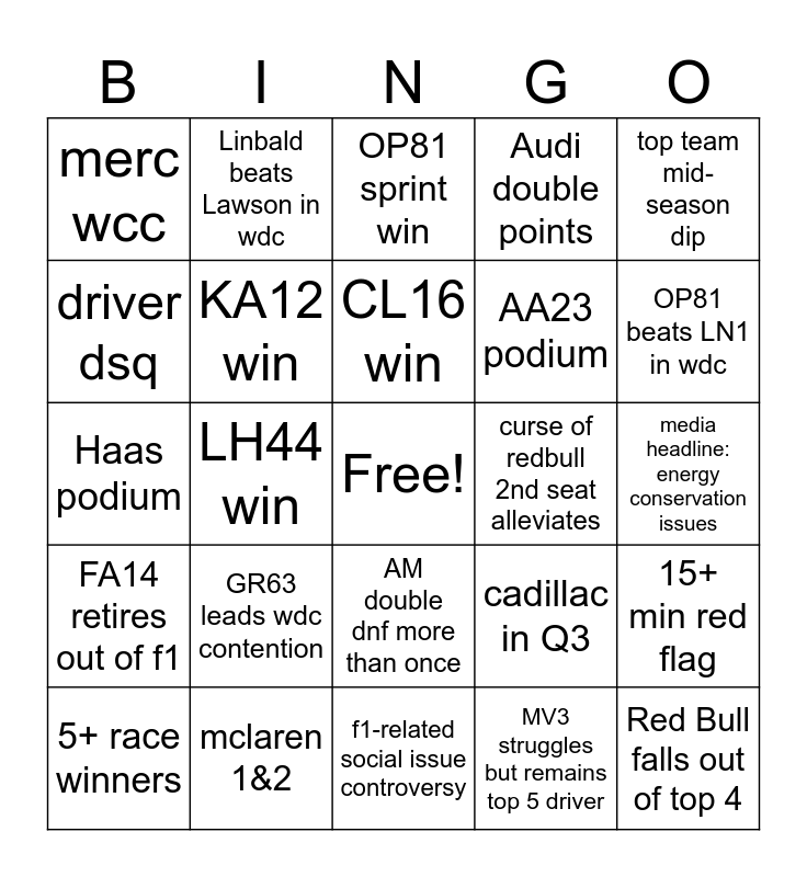 This bingo card has a free space and 24 words: GR63 leads wdc contention, mclaren 1&2, CL16 win, 5+ race winners, top team mid-season dip, merc wcc, driver dsq, Linbald beats Lawson in wdc, curse of redbull 2nd seat alleviates, AM double dnf more than once, AA23 podium, Haas podium, cadillac in Q3, 15+ min red flag, KA12 win, MV3 struggles but remains top 5 driver, media headline: energy conservation issues, OP81 sprint win, OP81 beats LN1 in wdc, LH44 win, Red Bull falls out of top 4, FA14 retires out of f1, Audi double points and f1-related social issue controversy.