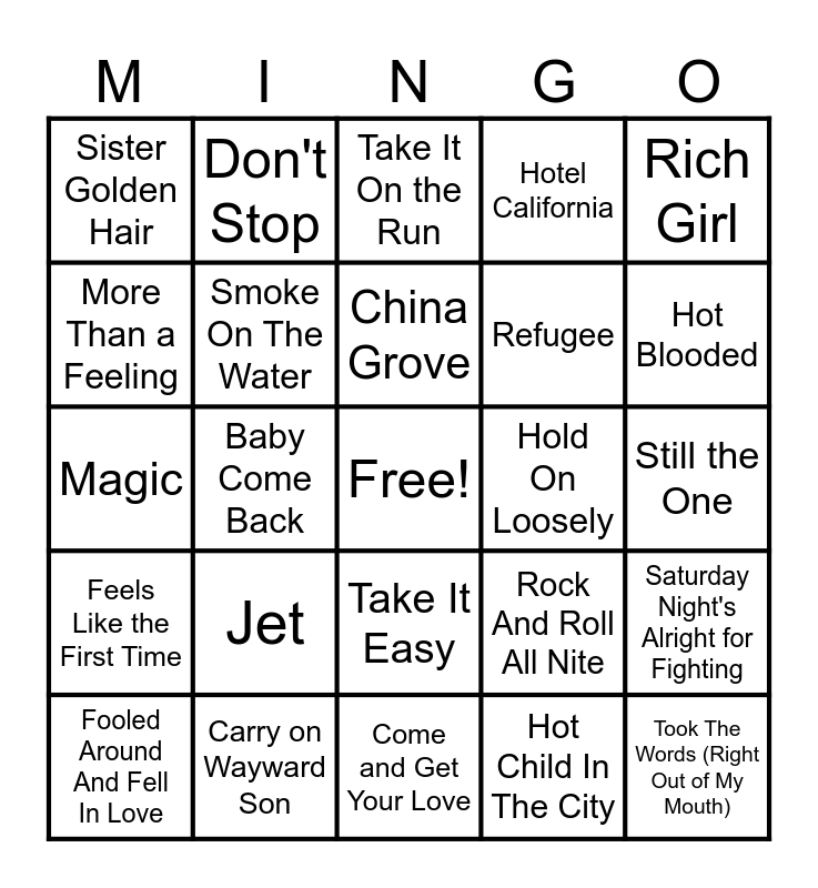 This bingo card has a free space and 35 words: American Girl, Feed My Frankenstein, School's Out, Smoke On The Water, Take It Easy, Hotel California, More Than a Feeling, Just What I Needed, China Grove, Shout It Out Loud, Magic, Rich Girl, Juke Box Hero, Born to Run, Sister Golden Hair, Hold On Loosely, Hot Child In The City, Baby Come Back, Feels Like the First Time, Took The Words (Right Out of My Mouth), Rock And Roll All Nite, Fooled Around And Fell In Love, Saturday Night's Alright for Fighting, Carry on Wayward Son, Take It On the Run, Hot Blooded, Fox On The Run, Can't Get Enought, Refugee, Still the One, My Sharona, Come and Get Your Love, Jet, Don't Stop and Baba O'Riley.