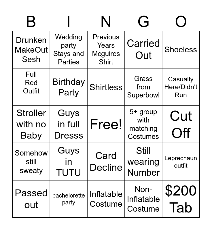 This bingo card has a free space and 24 words: Passed out, Guys in TUTU, Shirtless, Non-Inflatable Costume, Shoeless, Drunken MakeOut Sesh, Wedding party Stays and Parties, Previous Years Mcguires Shirt, 5+ group with matching Costumes, Cut Off, Stroller with no Baby, Birthday Party, Still wearing Number, Leprechaun outfit, Full Red Outfit, bachelorette party, Inflatable Costume, Carried Out, Casually Here/Didn't Run, Somehow still sweaty, Guys in full Dresss, Card Decline, Grass from Superbowl and $200 Tab.