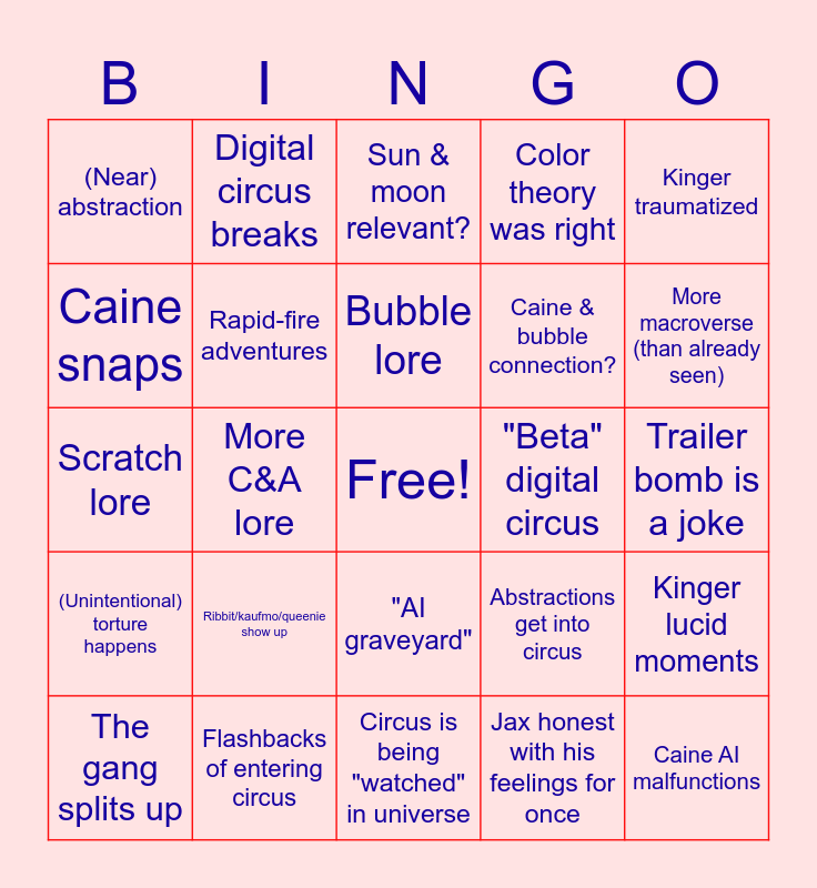 This bingo card has a free space and 24 words: Ribbit/kaufmo/queenie show up, Flashbacks of entering circus, Bubble lore, The gang splits up, Kinger traumatized, (Near) abstraction, Caine snaps, Digital circus breaks, "Beta" digital circus, "AI graveyard", Caine & bubble connection?, Scratch lore, Abstractions get into circus, Kinger lucid moments, Rapid-fire adventures, Jax honest with his feelings for once, Trailer bomb is a joke, Sun & moon relevant?, More macroverse (than already seen), More C&A lore, Caine AI malfunctions, (Unintentional) torture happens, Color theory was right and Circus is being "watched" in universe.