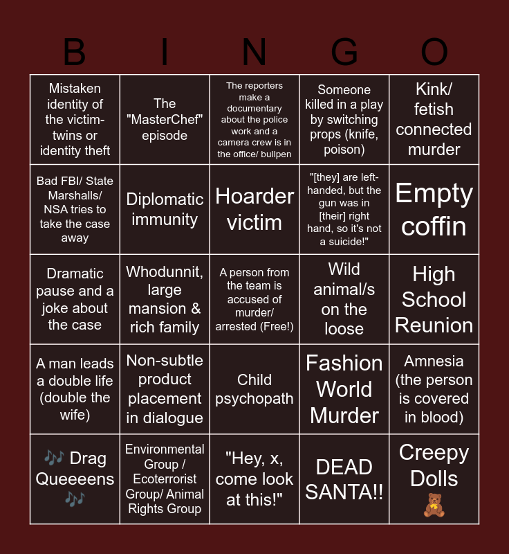 This bingo card has a free space and 28 words: Amnesia (the person is covered in blood), Cult Episode, "[they] are left-handed, but the gun was in [their] right hand, so it's not a suicide!", DEAD SANTA!!, Bad FBI/ State Marshalls/ NSA tries to take the case away, The reporters make a documentary about the police work and a camera crew is in the office/ bullpen, The "MasterChef" episode, A man leads a double life (double the wife), Wild animal/s on the loose, 🎶 Drag Queeeens 🎶, Dramatic pause and a joke about the case, Someone killed in a play by switching props (knife, poison), Environmental Group / Ecoterrorist Group/ Animal Rights Group, "Hey, x, come look at this!", Empty coffin, Body/ body part in a time capsule, Non-subtle product placement in dialogue, Diplomatic immunity, Hoarder victim, Child psychopath, Mistaken identity of the victim- twins or identity theft, Murder couple, Creepy Dolls 🧸, Whodunnit, large mansion & rich family, High School Reunion, Fashion World Murder, Kink/ fetish connected murder and 🔮witches🔮.