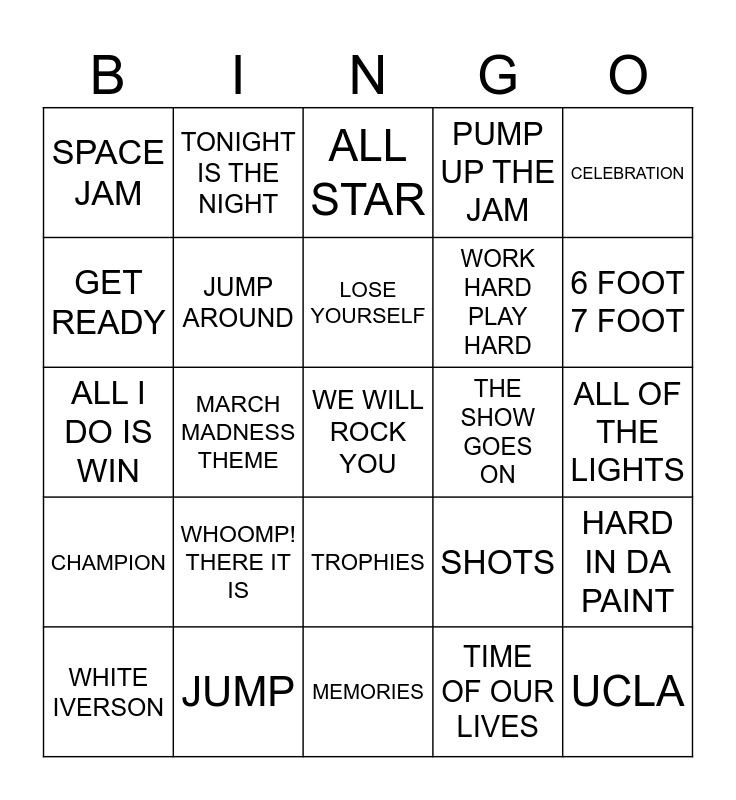 This bingo card has 31 words: MEMORIES, SIRIUS, MARCH MADNESS THEME, LEVELS, SPACE JAM, ALL STAR, JUMP AROUND, SHOTS, THE SHOW GOES ON, TIME OF OUR LIVES, ALL OF THE LIGHTS, WE WILL ROCK YOU, UCLA, BALLIN', 6 FOOT 7 FOOT, BASKETBALL, HARD IN DA PAINT, WHOOMP! THERE IT IS, CHAMPION, TROPHIES, CELEBRATION, FOREVER, WHITE IVERSON, TONIGHT IS THE NIGHT, WORK HARD PLAY HARD, GET READY, PUMP UP THE JAM, ALL I DO IS WIN, JUMP, LOSE YOURSELF and THE FINAL COUNTDOWN.
