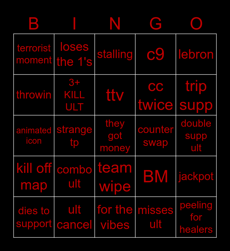 This bingo card has a free space and 24 words: combo ult, ult cancel, ttv, dies to support, lebron, terrorist moment, throwin, loses the 1's, counter swap, team wipe, cc twice, animated icon, BM, jackpot, 3+ KILL ULT, misses ult, double supp ult, stalling, trip supp, strange tp, peeling for healers, kill off map, c9 and for the vibes.