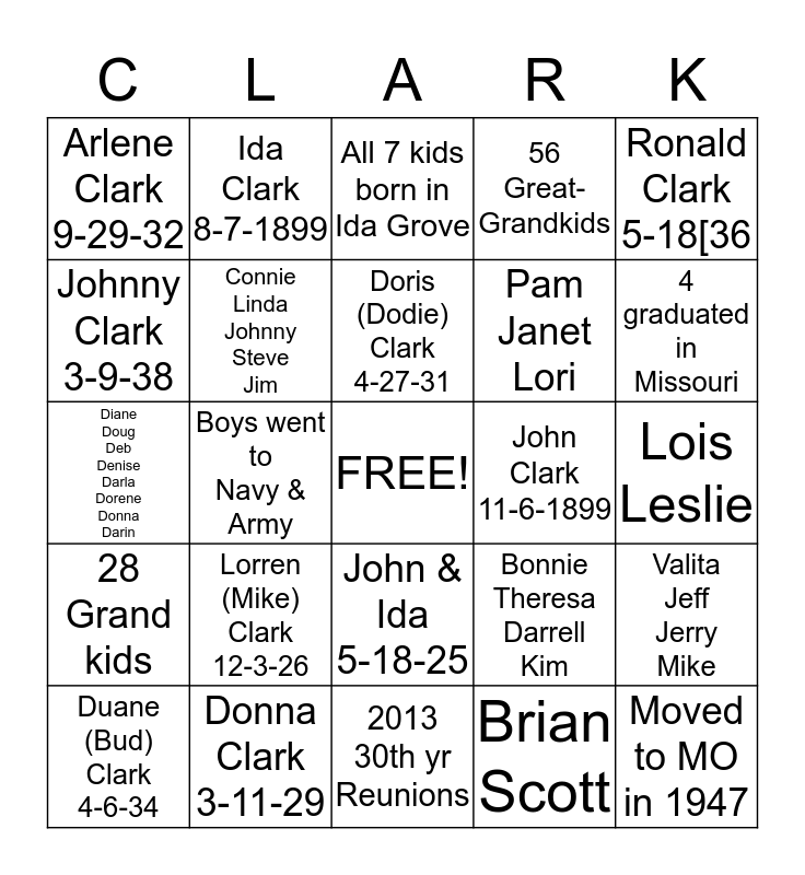 This bingo card has a free space and 24 words: Lorren (Mike) Clark 12-3-26, Donna Clark 3-11-29, Doris (Dodie) Clark 4-27-31, Duane (Bud) Clark 4-6-34, Ronald Clark 5-18[36, Arlene Clark 9-29-32, Johnny Clark 3-9-38, Ida Clark 8-7-1899, John Clark 11-6-1899, John & Ida 5-18-25, Pam Janet Lori, Diane Doug Deb Denise Darla Dorene Donna Darin, Bonnie Theresa Darrell Kim, Valita Jeff Jerry Mike, Connie Linda Johnny Steve Jim, Brian Scott, Lois Leslie, All 7 kids born in Ida Grove, 4 graduated in Missouri, Boys went to Navy & Army, Moved to MO in 1947, 28 Grand kids, 56 Great- Grandkids and 2013 30th yr Reunions.