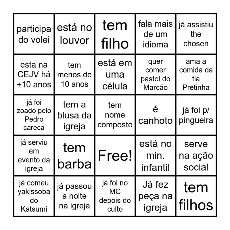 This bingo card has 26 words: Free!, Já fez peça na igreja, está em uma célula, já passou a noite na igreja, já assistiu the chosen, participa do volei, esta na CEJV há +10 anos, está no louvor, já foi p/ pingueira, está no min. infantil, quer comer pastel do Marcão, já foi zoado pelo Pedro careca, serve na ação social, já comeu yakissoba do Katsumi, tem a blusa da igreja, tem cachorro, fala mais de um idioma, já serviu em evento da igreja, tem filho, tem nome composto, ama a comida da tia Pretinha, já foi no MC depois do culto, é canhoto, tem barba, tem menos de 10 anos and tem filhos.