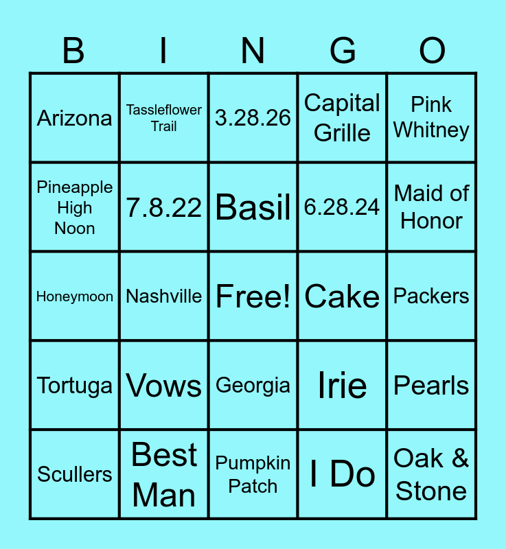 This bingo card has a free space and 33 words: Jason, Ashley, Nashville, Jamaica, Tortuga, 7.8.22, Pink Whitney, Scullers, Tassleflower Trail, Woodford, Basil, 3.28.26, Rings, Toast, Cake, Maid of Honor, Best Man, Honeymoon, Vows, Irie, Georgia, Puerto Rico, Arizona, Packers, Pumpkin Patch, Oak & Stone, Capital Grille, 6.28.24, Pineapple High Noon, Pearls, Prosecco, I Do and LOVE.