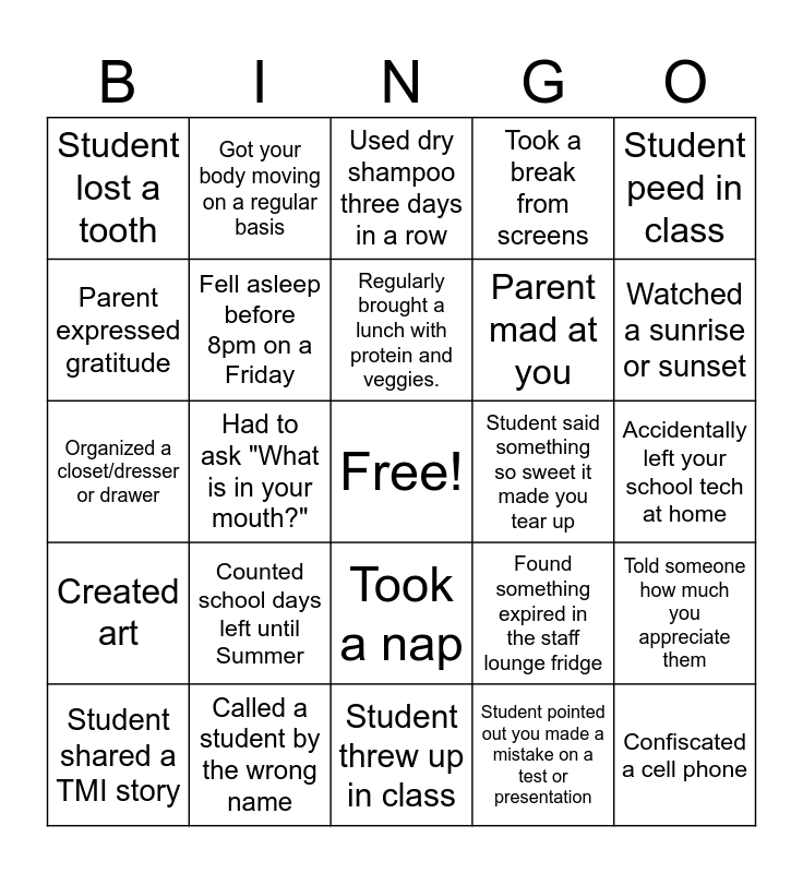 This bingo card has a free space and 29 words: Student shared a TMI story, Been late, Had to ask "What is in your mouth?", Been hit by a ball on the playground, Student lost a tooth, Used dry shampoo three days in a row, Fell asleep before 8pm on a Friday, Counted school days left until Summer, Student said something so sweet it made you tear up, Called a student by the wrong name, Accidentally left your school tech at home, Confiscated a cell phone, Student threw up in class, Student pointed out you made a mistake on a test or presentation, Watched a sunrise or sunset, Listened to music that makes you happy at work, Took a nap, Created art, Student peed in class, Organized a closet/dresser or drawer, Found something expired in the staff lounge fridge, Turned your back for one minute and something crazy happened, Parent mad at you, Parent expressed gratitude, Took a break from screens, Got your body moving on a regular basis, Told someone how much you appreciate them, Regularly brought a lunch with protein and veggies. and Ate lunch from the vending machine.
