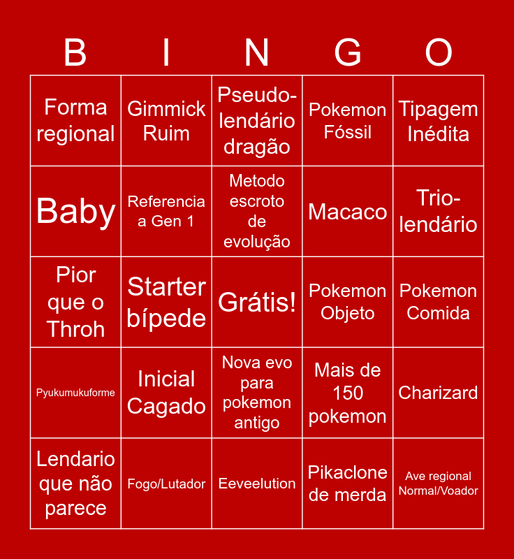 This bingo card has a free space and 24 words: Inicial Cagado, Fogo/Lutador, Metodo escroto de evolução, Lendario que não parece, Tipagem Inédita, Forma regional, Baby, Gimmick Ruim, Pokemon Objeto, Nova evo para pokemon antigo, Macaco, Pior que o Throh, Mais de 150 pokemon, Charizard, Referencia a Gen 1, Pikaclone de merda, Pokemon Comida, Pseudo-lendário dragão, Trio-lendário, Starter bípede, Ave regional Normal/Voador, Pyukumukuforme, Pokemon Fóssil and Eeveelution.