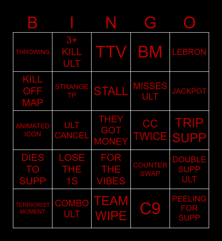 This bingo card has a free space and 24 words: TERRIORIST MOMENT, LOSE THE 1S, STALL, C9, LEBRON, THROWING, 3+ KILL ULT, TTV, CC TWICE, TRIP SUPP, ANIMATED ICON, STRANGE TP, COUNTER SWAP, DOUBLE SUPP ULT, KILL OFF MAP, COMBO ULT, TEAM WIPE, BM, JACKPOT, DIES TO SUPP, ULT CANCEL, FOR THE VIBES, MISSES ULT and PEELING FOR SUPP.