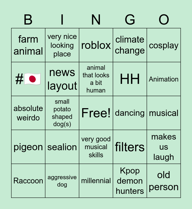This bingo card has a free space and 29 words: Raccoon, manatee, small potato shaped dog(s), something very dangerous, farm animal, roblox, news layout, sealion, dancing, aggressive dog, musical, old person, millennial, Kpop demon hunters, Animation, bad instrument / singing, very good musical skills, pigeon, cosplay, absolute weirdo, filters, seal, HH, #🇯🇵, climate change, very nice looking place, makes us laugh, animal that looks a bit human and actually quite impressive.