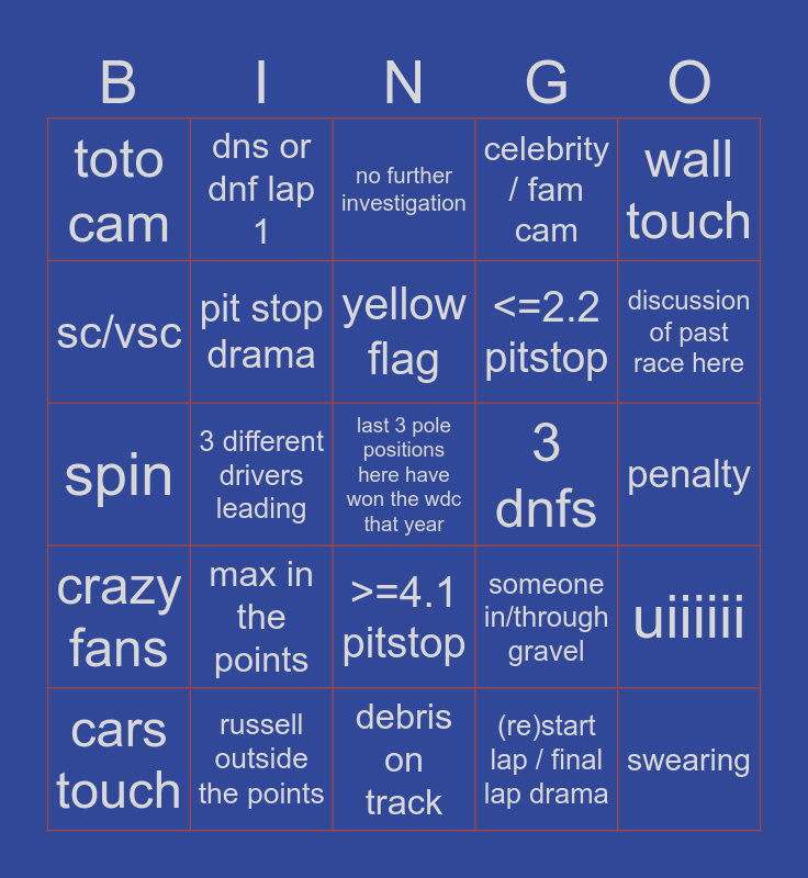 This bingo card has a free space and 24 words: max in the points, russell outside the points, yellow flag, cars touch, wall touch, toto cam, sc/vsc, dns or dnf lap 1, 3 dnfs, >=4.1 pitstop, <=2.2 pitstop, spin, someone in/through gravel, uiiiiii, pit stop drama, (re)start lap / final lap drama, penalty, no further investigation, discussion of past race here, 3 different drivers leading, swearing, crazy fans, celebrity / fam cam and debris on track.