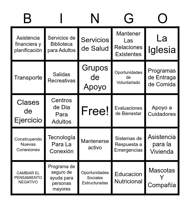 This bingo card has a free space and 24 words: Tecnología Para La Conexión, Programa de seguro de ayuda para personas mayores, Grupos de Apoyo, CAMBIAR EL PENSAMIENTO NEGATIVO, La Iglesia, Asistencia financiera y planificación, Transporte, Servicios de Biblioteca para Adultos, Evaluaciones de Bienestar, Mantenerse activo, Oportunidades de Voluntariado, Clases de Ejercicio, Sistemas de Respuesta a Emergencias, Asistencia para la Vivienda, Salidas Recreativas, Educacion Nutricional, Apoyo a Cuidadores, Servicios de Salud, Programas de Entraga de Comida, Centros de Dia Para Adultos, Mascotas Y Compañía, Construyendo Nuevas Conexiones, Mantener Las Relaciones Existentes and Oportunidades Sociales Estructuradas.