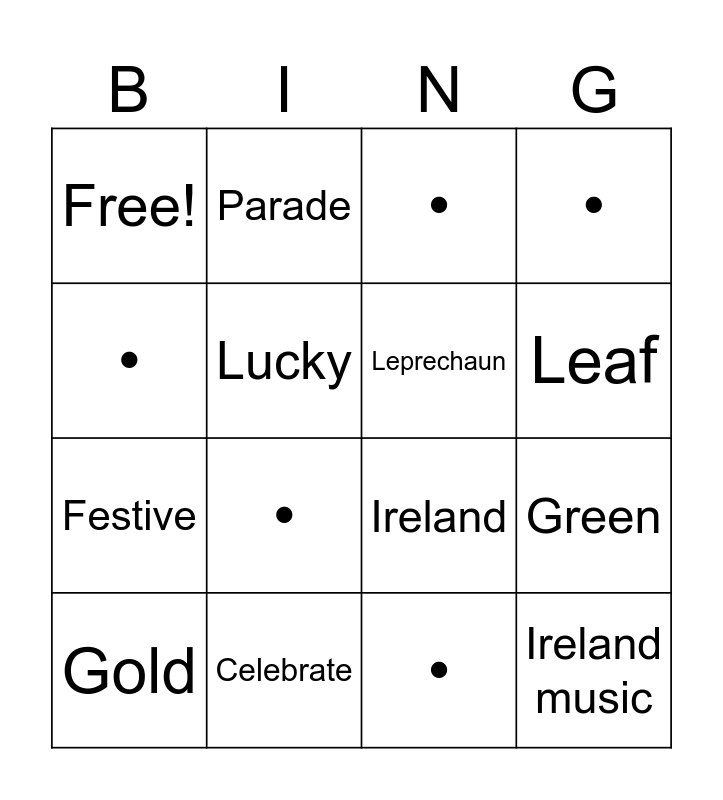 This bingo card has 38 words: Pint, March 17, Pot of gold, Green, Gold, Rainbow, Ireland, Emerald, Free!, Lucky, Clover, Leaf, Festive, Celebrate, Leprechaun, Ireland music, Welcome, Parade, Shamrock, •, •, •, •, •, •, •, •, •, •, •, •, •, •, •, •, •, • and •.