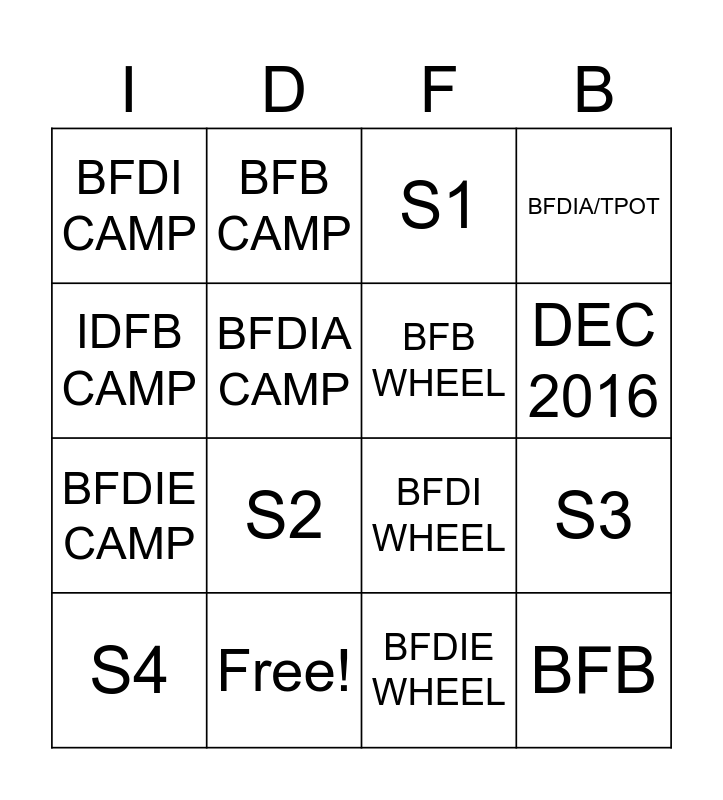 This bingo card has 25 words: 2025, OCT 2016, DEC 2016, OCT 2026, IDFB CAMP, BFDI CAMP, BFDIA CAMP, BFB CAMP, Free!, TPOT CAMP, BFDIE CAMP, BFDI WHEEL, BFDIA WHEEL, IDFB WHEEL, BFB WHEEL, TPOT WHEEL, BFDIE WHEEL, S1, S2, S3, S4, BFDI, BFB, BFDIA/TPOT and IDFB/B FDIE.