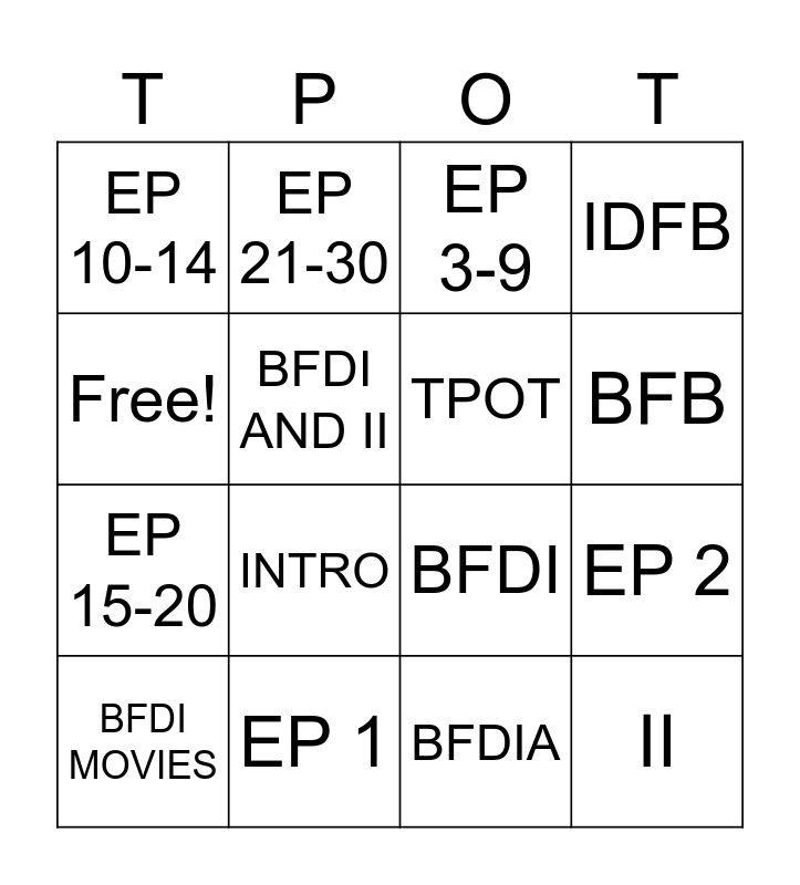 This bingo card has 16 words: EP 1, EP 2, EP 3-9, EP 10-14, EP 15-20, EP 21-30, BFDI, BFDIA, Free!, BFDI AND II, BFDI MOVIES, IDFB, INTRO, BFB, TPOT and II.