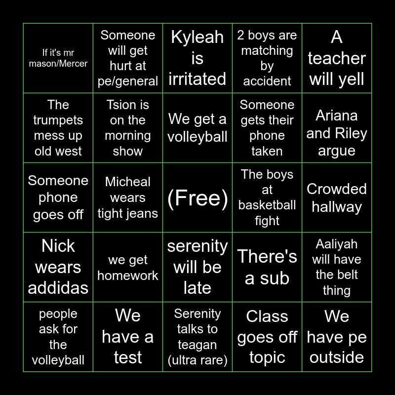 This bingo card has a free space and 24 words: we get homework, We have a test, We get a volleyball, people ask for the volleyball, A teacher will yell, If it's mr mason/Mercer, The trumpets mess up old west, Someone will get hurt at pe/general, The boys at basketball fight, serenity will be late, Someone gets their phone taken, Someone phone goes off, There's a sub, Aaliyah will have the belt thing, Tsion is on the morning show, Class goes off topic, Crowded hallway, Kyleah is irritated, Ariana and Riley argue, Micheal wears tight jeans, We have pe outside, Nick wears addidas, 2 boys are matching by accident and Serenity talks to teagan (ultra rare).