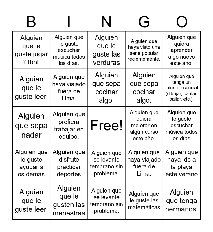 This bingo card has a free space and 39 words: Alguien que tenga la misma comida favorita que tú., Alguien que le guste jugar fútbol., Alguien que tenga una mascota., Alguien que haya viajado fuera de Lima., Alguien que le guste leer., Alguien que se levante temprano sin problema., Alguien que sepa cocinar algo., Alguien que tenga un talento especial (dibujar, cantar, bailar, etc.)., Alguien que quiera aprender algo nuevo este año., Alguien que le guste ayudar a los demás., Alguien que prefiera trabajar en equipo., Alguien que haya visto una serie popular recientemente., Alguien que tenga hermanos., Alguien que le guste escuchar música todos los días., Alguien que quiera mejorar en algún curso este año., Alguien que disfrute practicar deportes, Alguien que tenga la misma comida favorita que tú., Alguien que le guste jugar fútbol., Alguien que tenga una mascota., Alguien que haya viajado fuera de Lima., Alguien que le guste leer., Alguien que se levante temprano sin problema., Alguien que sepa cocinar algo., Alguien que tenga un talento especial (dibujar, cantar, bailar, etc.)., Alguien que quiera aprender algo nuevo este año., Alguien que le guste ayudar a los demás., Alguien que prefiera trabajar en equipo., Alguien que haya visto una serie popular recientemente., Alguien que tenga hermanos., Alguien que le guste escuchar música todos los días., Alguien que quiera mejorar en algún curso este año., Alguien que disfrute practicar deportes, Alguien que le guste las verduras, Alguien que le gusten las menestras, Alguien que le guste las matemáticas, Alguien que le disfrute ver jugar voley, Alguien que haya ido a la playa este verano, Alguien que sepa nadar and Alguien que le guste los capibaras.