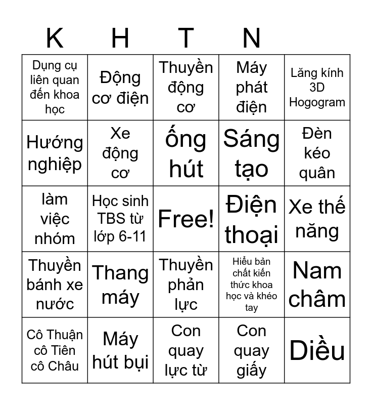 This bingo card has a free space and 29 words: Cô Thuận cô Tiên cô Châu, Tiết 6,7,8,9 chiều thứ 3 hàng tuần, Học sinh TBS từ lớp 6-11, Thích thực hành, Dụng cụ liên quan đến khoa học, Thuyền động cơ, Xe động cơ, Thang máy, Điện thoại, Máy hút bụi, Xe thế năng, Diều, Con quay lực từ, Con quay giấy, Đèn kéo quân, Cối xây gió, Thuyền phản lực, Thuyền bánh xe nước, Lăng kính 3D Hogogram, làm việc nhóm, Hiểu bản chất kiến thức khoa học và khéo tay, dao, kéo, súng bắn keo, Sáng tạo, Hướng nghiệp, Máy phát điện, Động cơ điện, Nam châm, ống hút and mút shop.