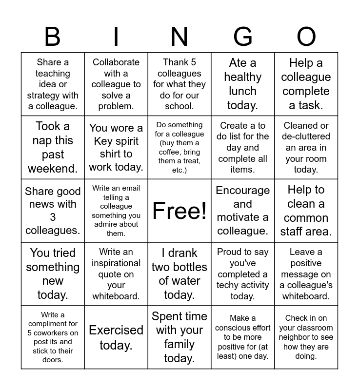This bingo card has a free space and 24 words: Write a compliment for 5 coworkers on post its and stick to their doors., Write an inspirational quote on your whiteboard., Do something for a colleague (buy them a coffee, bring them a treat, etc.), Make a conscious effort to be more positive for (at least) one day., Help a colleague complete a task., Share a teaching idea or strategy with a colleague., Collaborate with a colleague to solve a problem., Thank 5 colleagues for what they do for our school., Encourage and motivate a colleague., Help to clean a common staff area., Share good news with 3 colleagues., You wore a Key spirit shirt to work today., Proud to say you've completed a techy activity today., Leave a positive message on a colleague's whiteboard., Took a nap this past weekend., Exercised today., Spent time with your family today., Ate a healthy lunch today., Cleaned or de-cluttered an area in your room today., You tried something new today., Write an email telling a colleague something you admire about them., I drank two bottles of water today., Create a to do list for the day and complete all items. and Check in on your classroom neighbor to see how they are doing..