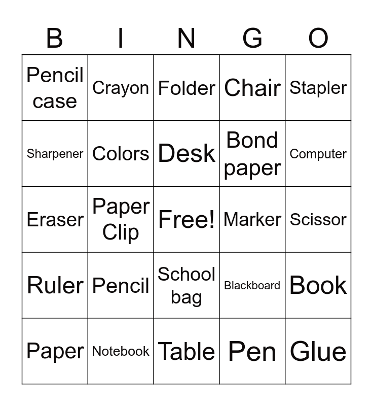 This bingo card has a free space and 24 words: Pencil, Notebook, Desk, Paper, Stapler, Pencil case, Sharpener, Crayon, Marker, School bag, Bond paper, Eraser, Blackboard, Book, Colors, Pen, Scissor, Folder, Computer, Paper Clip, Glue, Ruler, Chair and Table.