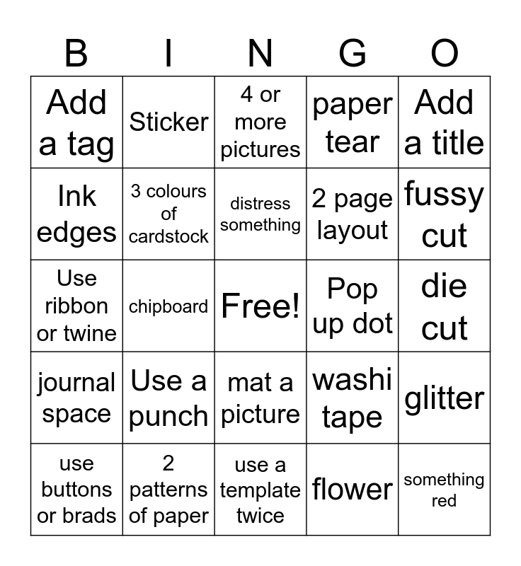 This bingo card has a free space and 24 words: Use a punch, 2 patterns of paper, distress something, use buttons or brads, Add a title, Add a tag, Ink edges, Sticker, Pop up dot, mat a picture, 2 page layout, Use ribbon or twine, washi tape, glitter, 3 colours of cardstock, flower, die cut, 4 or more pictures, fussy cut, chipboard, something red, journal space, paper tear and use a template twice.